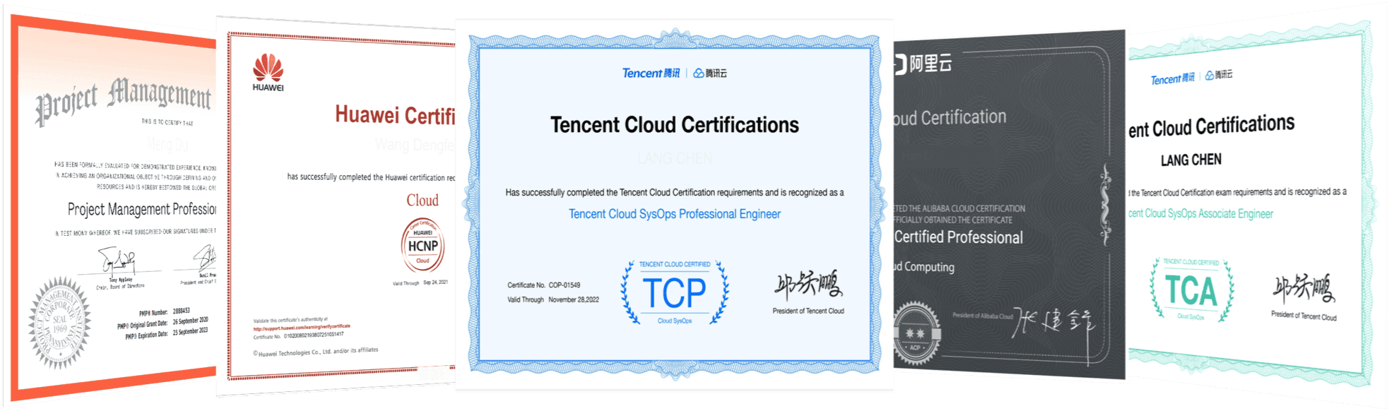 获得腾讯云、微软Azure、阿里云、华云、红帽、CNCF、PMI等认证机构颁发的证书