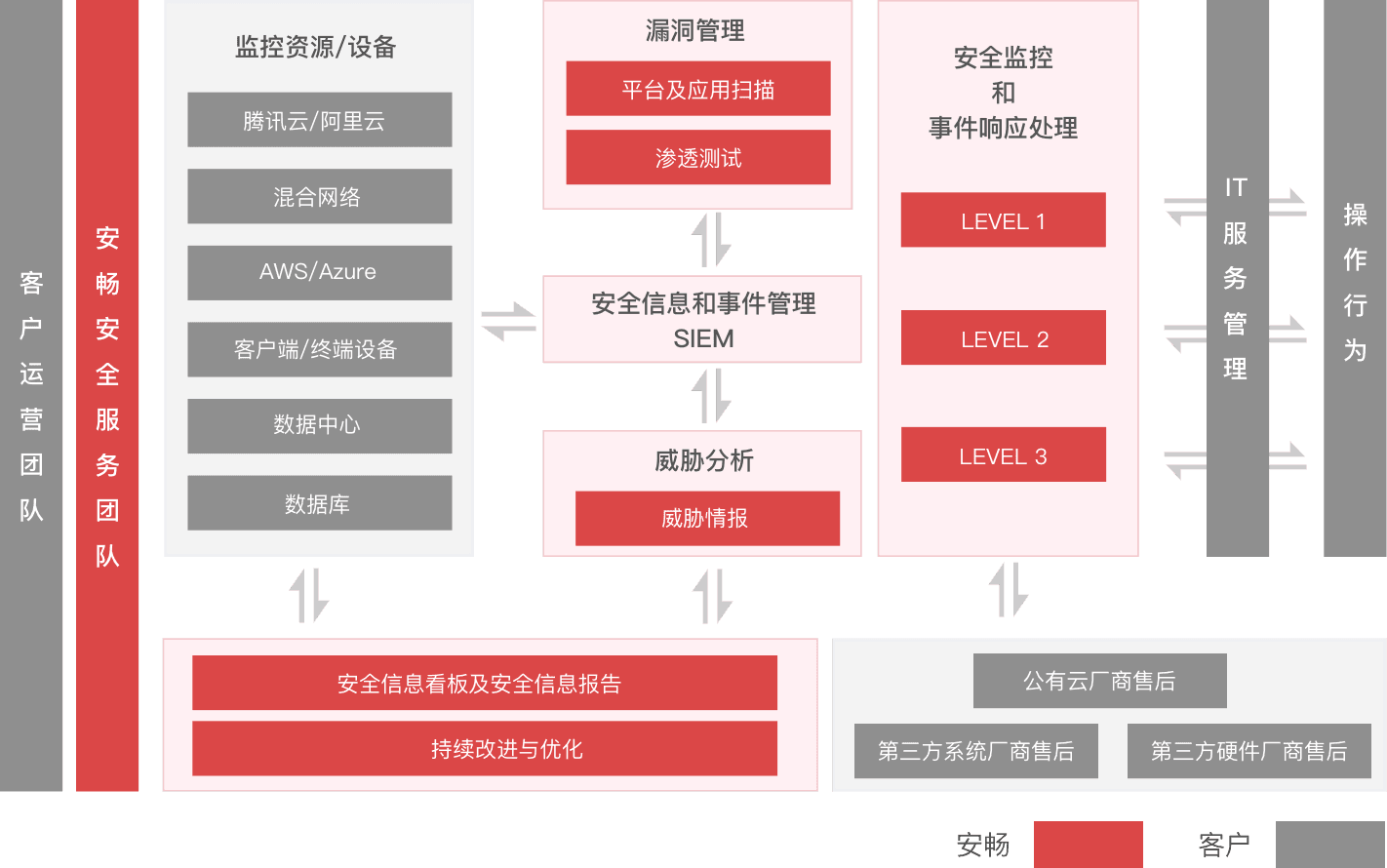 安畅以应用层防护产品为基础,纳管多云业务平台,并对接客户SIEM平台,提供7*24事件监控和响应,提供全生命周期的安全运维服务,覆盖事前预防、事中处理和事后优化。